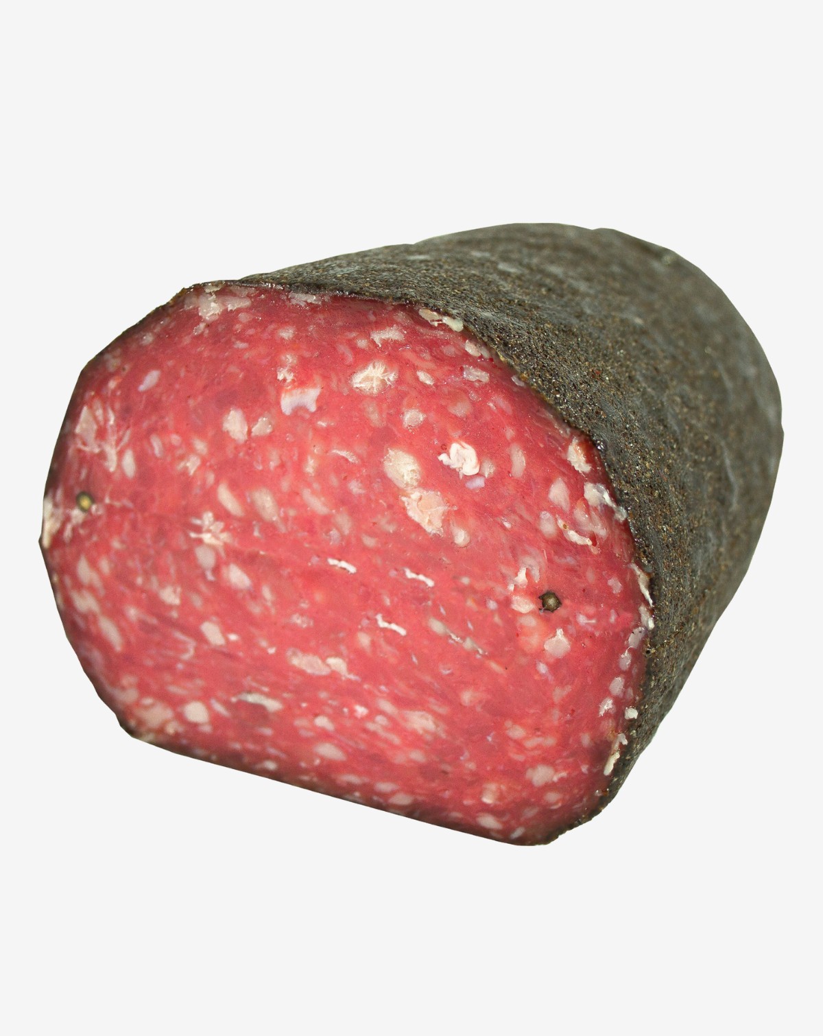 Embutido curado elaborado con carne de cerdo, recubierto con pimienta blanca. De sabor suave y especiado, con aroma característico y textura firme.
